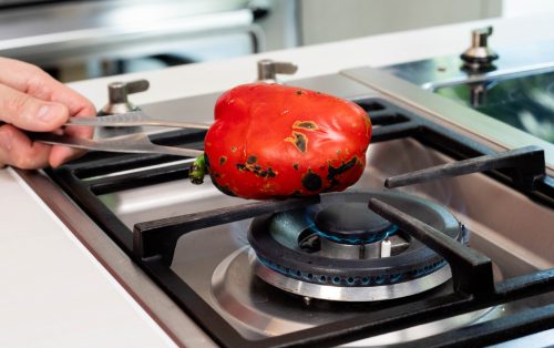 1.เผาพริกหวานสีแดงบนไฟโดยตรงจนผิวไหม้ทั่ว จากนั้นวางพักในภาชนะให้เย็น แล้วลอกผิวไหม้ออก คว้านเมล็ดและขั้วออก หั่นเนื้อพริกเป็นชิ้นยาว พักไว้