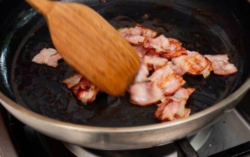 2.ใส่เบคอนลงในกระทะ เจียวด้วยไฟกลางจนกรอบ ตักขึ้นพักไว้ โดยเหลือน้ำมันเบคอนในกระทะประมาณ 1 ช้อนโต๊ะ