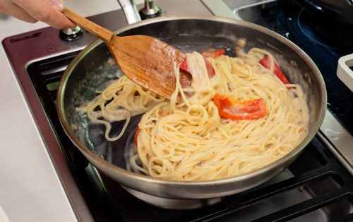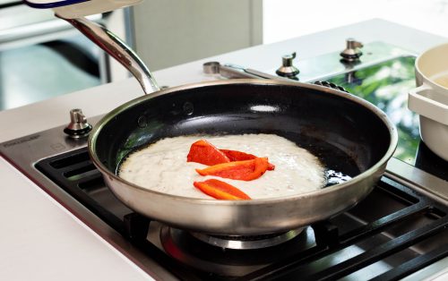 3.เทซอสคาร์โบนาราลงในกระทะใบเดิม ใส่พริกหวานเผาที่หั่นไว้ เคี่ยวให้ซอสเริ่มเดือดอ่อน ๆ และกลิ่นพริกหวานกระจาย