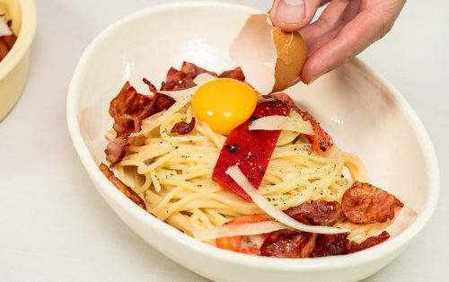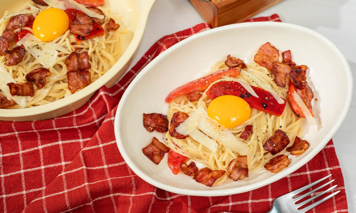 5.ตักเส้นใส่จาน โรยเบคอนกรอบ พาร์มิซานชีส และวางไข่แดงด้านบน โรยพริกไทยดำอีกเล็กน้อยก่อนเสิร์ฟ