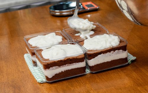 10.ประกอบเค้ก โดยวางเค้กชิฟฟ่อนโกโก้ชิ้นแรกลงในกล่อง ใส่ครีมมะพร้าวที่ตะล่อมกับวิปปิ้งครีมลงไป วางเค้กชิ้นที่สอง กดเบา ๆ จากนั้นแบ่งใส่ครีมมะพร้าวส่วนที่เหลือลงบนหน้าเค้ก ปิดฝากล่อง แช่เย็นประมาณ 2–3 ชั่วโมง ก่อนรับประทาน