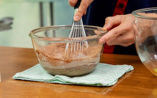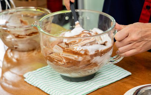 2.แยกไข่แดงและไข่ขาว ตีไข่แดงกับน้ำตาลทราย (1) น้ำมันรำข้าว และกลิ่นวานิลลา จนส่วนผสมเข้ากันดี แล้วจึงร่อนแป้งเค้ก ผงโกโก้ธรรมชาติ ผงฟู เบกกิ้งโซดา และเกลือลงไป ตีด้วยตะกร้อมือให้เนียน พักไว้