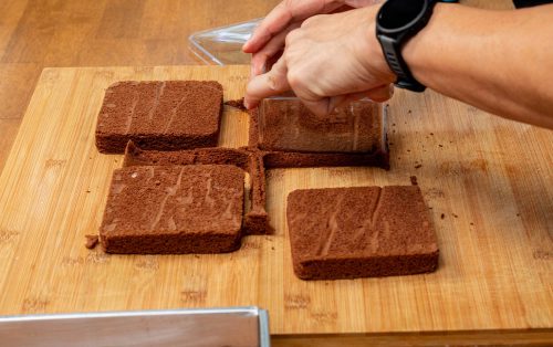 5.นำเค้กออกจากเตาอบ พักให้เย็น ใช้กล่องพลาสติกคว่ำกดตัดเค้กให้ได้ทั้งหมด 8 ชิ้น พักไว้