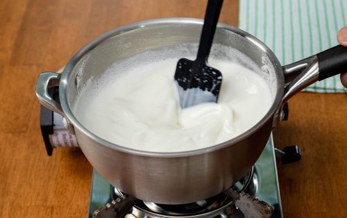 6.แช่แผ่นเจลาตินในน้ำเย็นให้นิ่ม ใส่น้ำมะพร้าว นมสด วิปครีม (1) น้ำตาลทราย เกลือ และแป้งกวนไส้ลงในหม้อ ตั้งไฟ กวนจนส่วนผสมสุกข้น