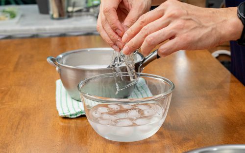 8.นำครีมมะพร้าววางบนชามน้ำแข็งเพื่อลดความร้อน ตักแบ่งครีมมะพร้าวออกมา 300 กรัม พักไว้