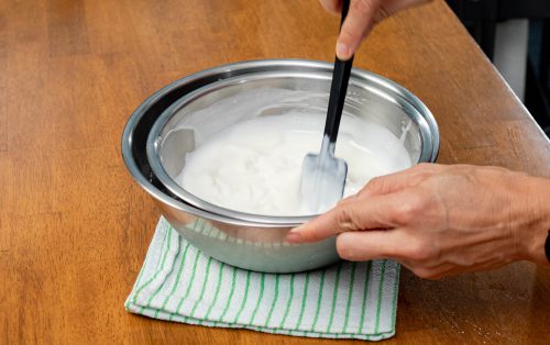 9.ตีวิปปิ้งครีม (2) ให้ตั้งยอดดี นำไปตะล่อมกับครีมมะพร้าว 300 กรัม อย่างเบามือ