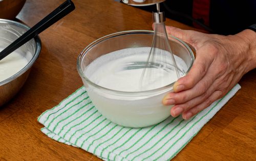 3.ผสมน้ำตาลทราย (2) กับครีมออฟทาร์ทาร์ ตีไข่ขาวจนเริ่มขึ้นฟู ค่อย ๆ ใส่น้ำตาลลงไป ตีจนได้เมอแรงค์ที่ตั้งยอดดี ตักเมอแรงค์ประมาณ 1/3 ส่วน ใส่ลงในส่วนผสมไข่แดง ตะล่อมให้ส่วนผสมเบาขึ้น จากนั้นใส่เมอแรงค์ที่เหลือ ตะล่อมจนเข้ากันดี