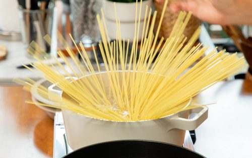 1.ตั้งน้ำสำหรับต้มเส้น ใส่เกลือ ต้มสปาเก็ตตี้ควิกคุกประมาณ 3 นาที ให้ได้ระดับ al dente