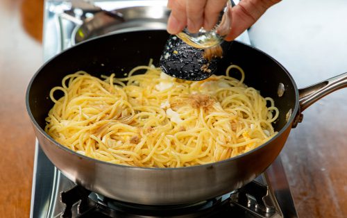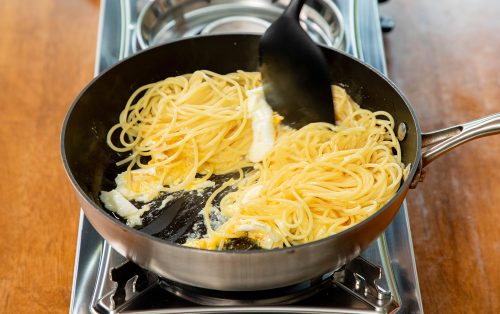 3.ใส่เส้นสปาเก็ตตี้ลงไป คลุกเบา ๆ ให้ไข่เคลือบเส้นเป็นชิ้นเล็ก ๆ ลักษณะคล้ายไข่ดาวคลุกข้าว