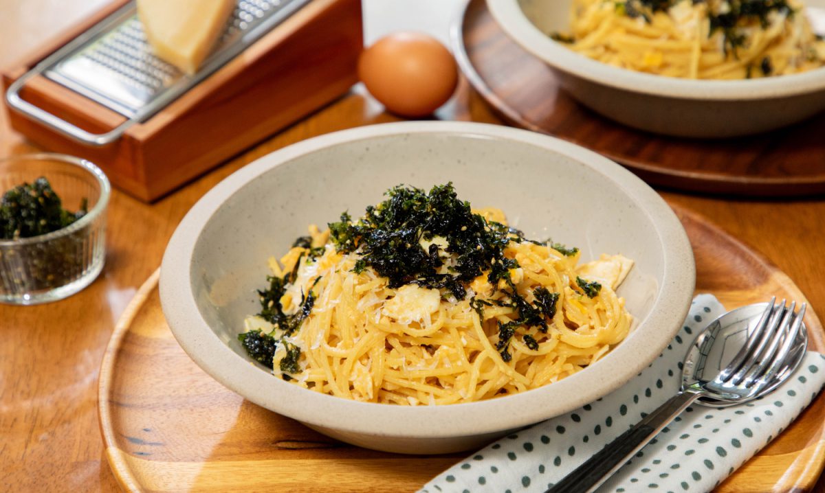 5.ตักใส่จานเสิร์ฟ โรยพาร์มิซาน และสาหร่ายปรุงรส เสิร์ฟทันทีขณะร้อน