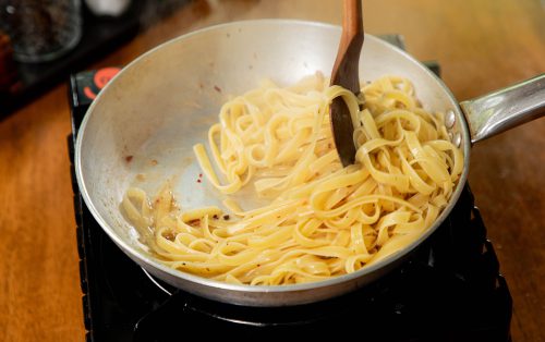 2.ระหว่างต้มเส้น ตั้งกระทะด้วยไฟอ่อน ใส่น้ำมันมะกอก เบคอน และกระเทียมลงไป เจียวจนเบคอนกรอบและกระเทียมมีสีเหลืองทอง ตักเบคอนและกระเทียมขึ้นพักไว้ เหลือน้ำมันไว้ในกระทะ 1 ช้อนโต๊ะ