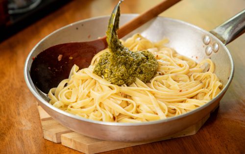 4.Add the pesto and toss until the sauce evenly coats the pasta.