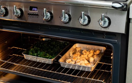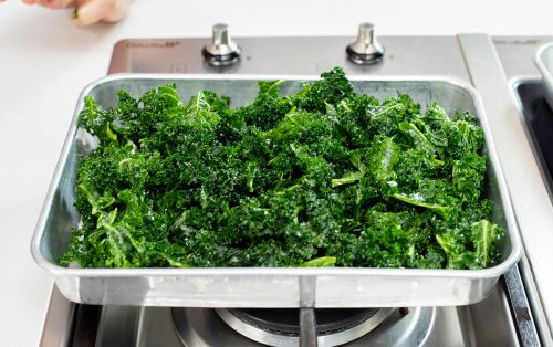 1.เด็ดใบเคลเป็นชิ้นพอดีคำ เคล้ากับน้ำมันรำข้าว โรยเกลือบาง ๆ นำเข้าอบที่ 180°C ประมาณ 15 นาที หรือจนกรอบ พักให้เย็นสนิท