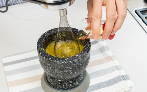 3.โขลกพริกเขียว รากผักชี กระเทียม กับเกลือให้แหลกดี ปรุงรสด้วยน้ำปลา น้ำมะนาว และน้ำตาลปี๊บ ใส่ไข่แดงคนให้เข้ากัน ค่อย ๆ เติมน้ำมันรำข้าว ใช้ตะกร้อตีให้เข้ากันดี ใส่พาร์มิซานชีสขูด ผสมให้เข้ากัน
