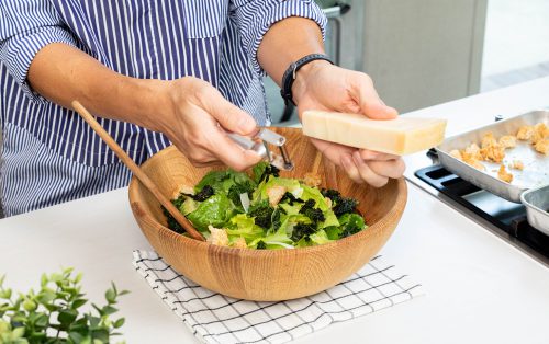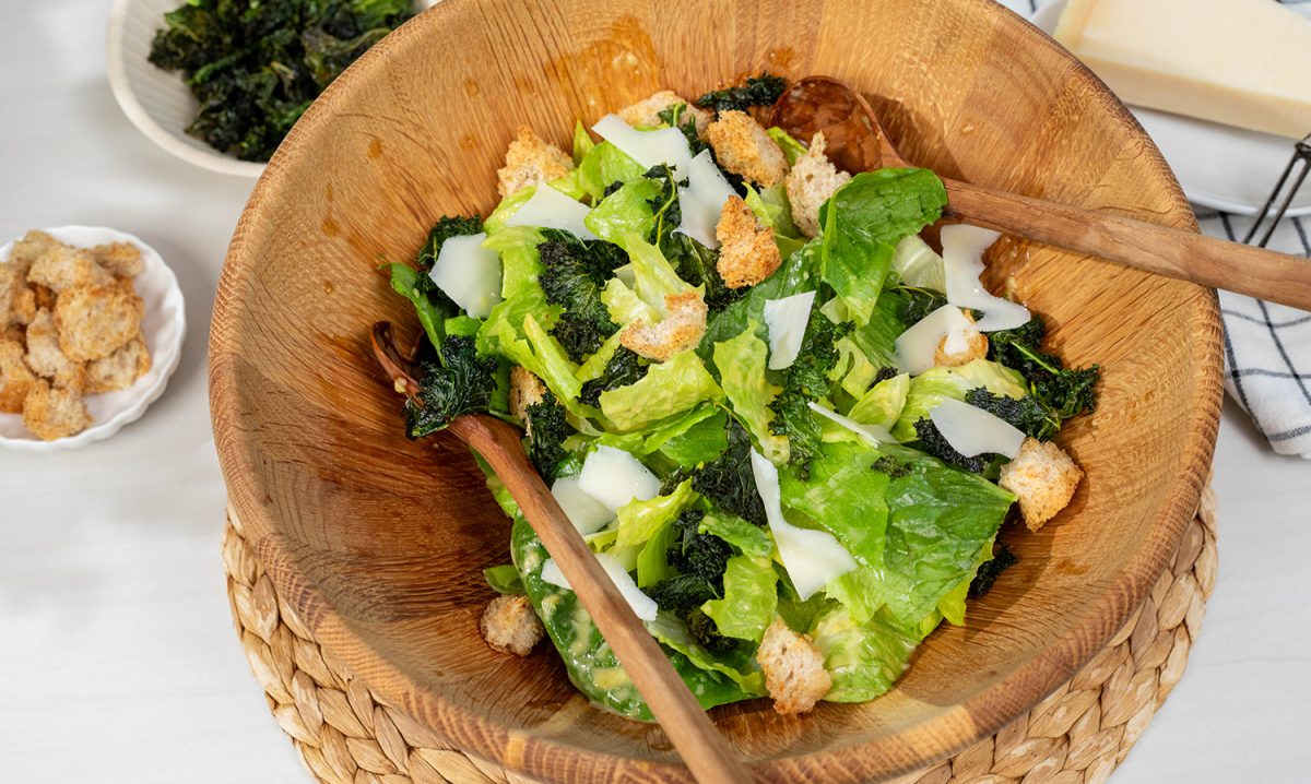 4.เมื่อต้องการเสิร์ฟ เคล้าผักคอสกับน้ำสลัดให้เคลือบบาง ๆ ตักใส่จาน วางเคลอบกรอบ และครูตองด้านบน โรยพาร์มิซานชีสขูดเพิ่มอีกเล็กน้อย เสิร์ฟทันที