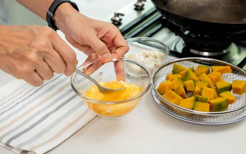 3.ดันฟักทองไปด้านหนึ่งของกระทะ เทส่วนผสมไข่ลงไป กรอกกระทะให้ไข่กระจายทั่ว ๆ รอจนเริ่มเซตตัว