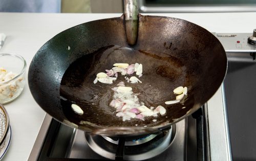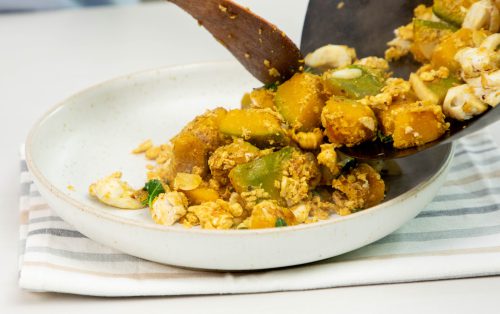 2.ตั้งกระทะใส่น้ำมันรำข้าว ผัดกระเทียมและหอมแดงจนหอม ใส่ฟักทองลงไป ผัดให้พอขึ้นสี