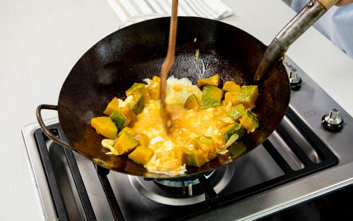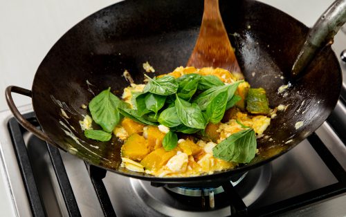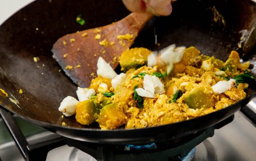 4.ช้อนฟักทองมากลบไข่ที่กำลังสุก จากนั้นปรุงรสด้วยซีอิ๊วขาว ซอสปรุงรส และน้ำตาลทราย ใส่ใบโหระพาและเนื้อปูครึ่งหนึ่ง คลุกให้เข้ากัน