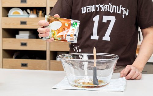 1.ผสมน้ำมันพืช น้ำผึ้ง กะทิผง ผงอบเชย และเกลือให้เข้ากันดี