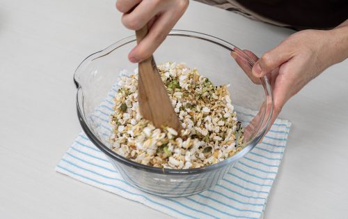 2.เทส่วนผสมลงบน ข้าวเม่า ข้าวเม่าราง ข้าวตอก เมล็ดฟักทอง เมล็ดทานตะวัน และงาดำ คลุกให้ส่วนผสมน้ำเคลือบกระจายทั่ว