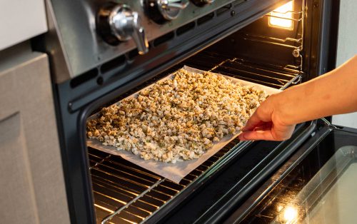 3.กระจายส่วนผสมลงบนถาดอบ อบที่ 180 องศาเซลเซียส ไฟบน–ล่าง ประมาณ 15–20 นาที หรือจนกรอบหอม จากนั้นพักให้เย็นสนิท