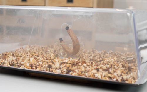 4.เมื่อกราโนล่าเย็นดีแล้ว นำไปรมควันเทียนหอมไทย 1–2 รอบ เพื่อเพิ่มกลิ่นหวานละมุนแบบโบราณ