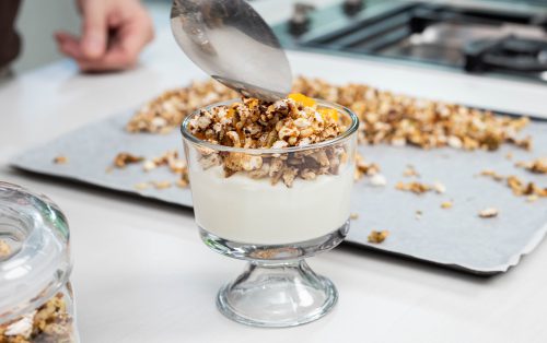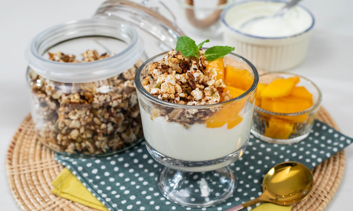 5.เสิร์ฟกราโนล่ากับโยเกิร์ตและผลไม้สด เช่น มะม่วงสุก หรือผลไม้ตามฤดูกาล
