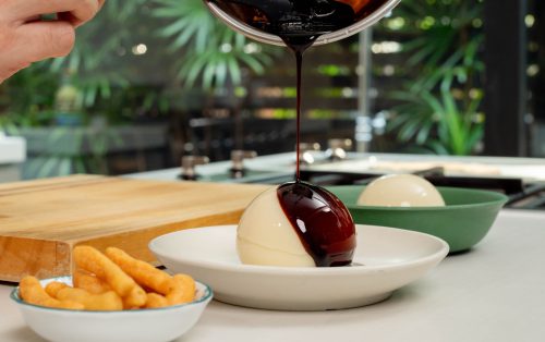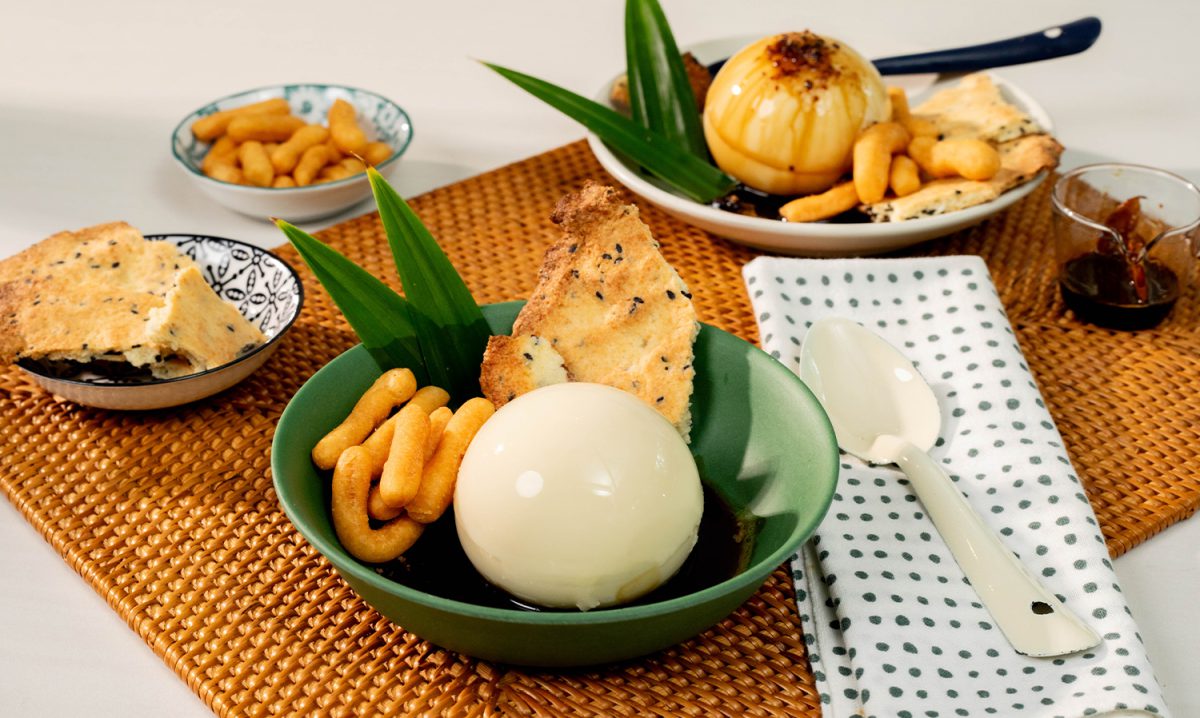 10.แกะพุดดิ้งใส่ถ้วย ราดซอสขิง โรยครัมเบิลกากถั่วเหลือง เสิร์ฟพร้อมปาท่องโก๋ทอด และตกแต่งด้วยใบเตย