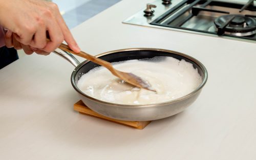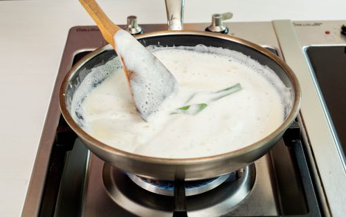3.ตั้งไฟกลางค่อนไปทางอ่อน คนตลอดเวลาเพื่อป้องกันไหม้ จนส่วนผสมข้นและสุก