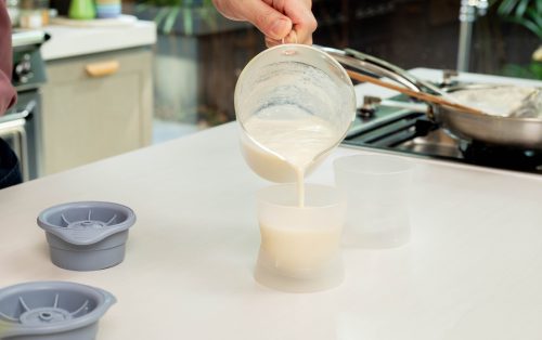6.เทใส่พิมพ์ พักให้เย็น จากนั้นแช่เย็นอย่างน้อย 2–3 ชั่วโมงจนเซ็ตตัว