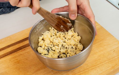 7.ทำครัมเบิลกากถั่วเหลือง โดยผสมกากถั่วเหลือง เนย น้ำตาล แป้ง และงาดำ คลุกให้เข้ากัน