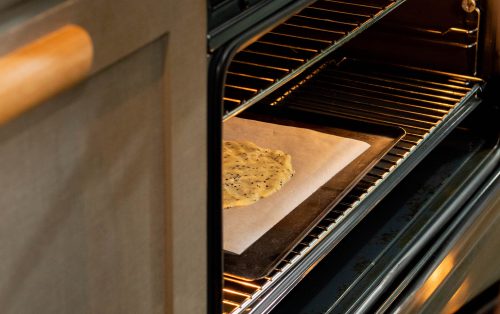8.แผ่ส่วนผสมบาง ๆ บนกระดาษไข อบที่ 180 องศาเซลเซียส ประมาณ 15– นาที หรือจนสีทอง พักให้เย็นแล้วหักเป็นชิ้น