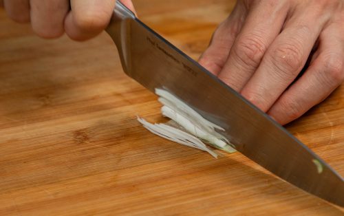 1.หั่นต้นหอมญี่ปุ่นเป็นท่อน ผ่าเปิดเอาแกนกลางออก แล้วสับหยาบๆ ส่วนใบด้านนอก ซอยเป็นเส้น แช่น้ำเพื่อลดความเผ็ดขม