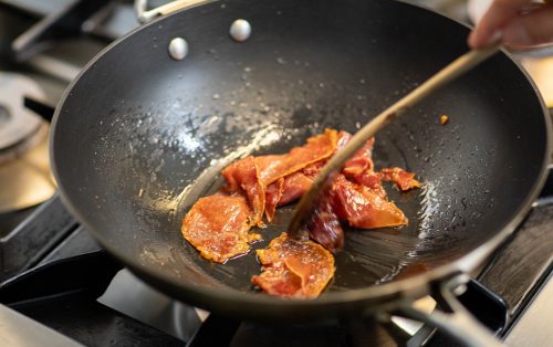 2.ตั้งกระทะใส่น้ำมันเพียงบาง ๆ ทอดพาร์ม่าแฮมจนกรอบ ตักขึ้นพักให้สะเด็ดน้ำมัน สับครึ่งหนึ่ง สำหรับส่วนที่เหลือเก็บไว้สำหรับตกแต่ง