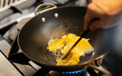 3.อุ่นกระทะให้ร้อน ใส่น้ำมัน ตีไข่กับเกลือเล็กน้อยแล้วเทลงกระทะ คนให้พอสุกนุ่ม ตักใส่ชามรวมกับข้าว