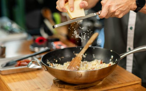 6.ยกกระทะออกจากความร้อน ใส่พาร์มิซานขูด คลุกให้กระจายทั่ว