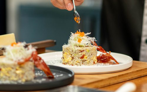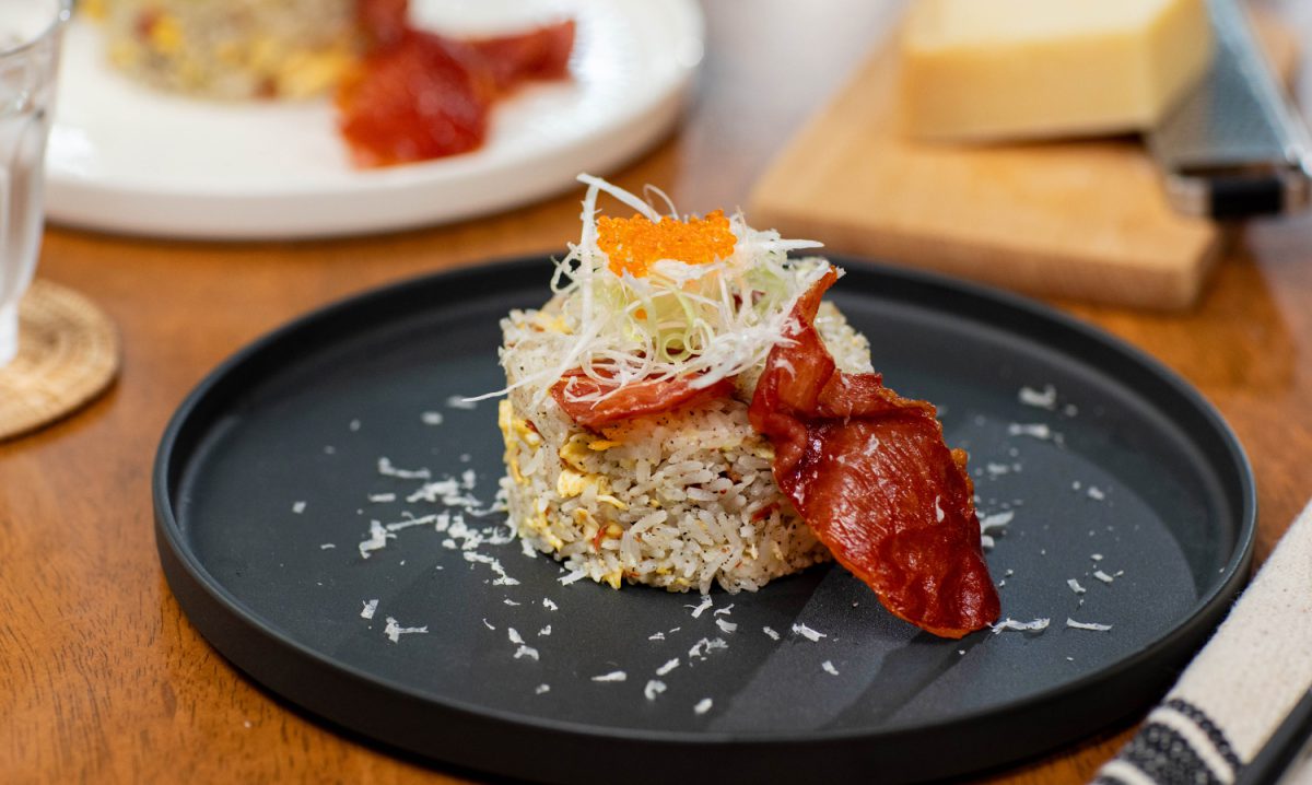 7.ตักข้าวผัดใส่จาน วางพาร์ม่าแฮมกรอบชิ้นใหญ่ตามลงไป โรยหน้าด้วยต้นหอมญี่ปุ่นซอยเส้น พาร์มิซาน และไข่กุ้ง