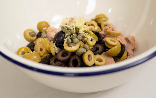 1.บิทูน่าเป็นชิ้นเล็ก ๆ ใส่ในชามผสม กับมะกอกเขียวและมะกอกดำที่ซอยบาง ๆ เคเปอร์ น้ำเลมอน และผิวเลมอน พักไว้