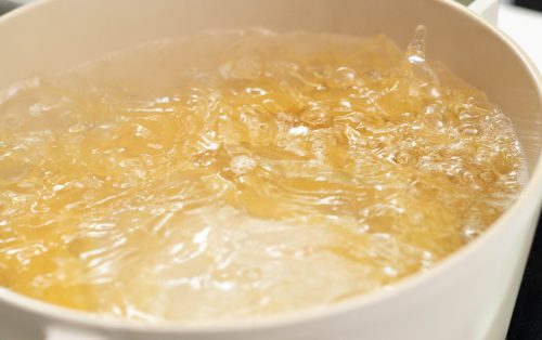 2.ตั้งน้ำใส่เกลือ ต้มเส้นสปาเก็ตตินีให้ได้ระดับ al dente ตักน้ำต้มเส้นเก็บไว้เล็กน้อย