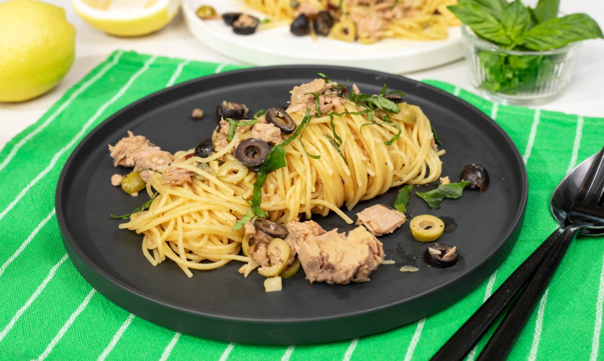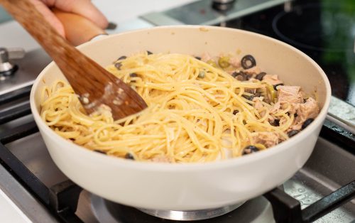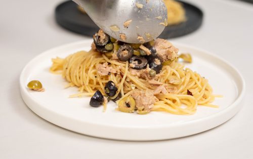 3.ตั้งกระทะใส่น้ำมันมะกอก ผัดแองโชวี่ให้แตกเป็นชิ้นเล็ก ๆ ใส่กระเทียมสับ หอมแดงสับ และพริกแห้งหั่นแว่น ปรุงรสด้วยเกลือ ผัดให้สุกหอม ใส่น้ำต้มเส้นเล็กน้อย ตามด้วยเส้นสปาเก็ตตินี และส่วนผสมทูน่า ผัดให้เข้ากัน