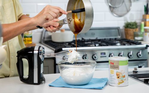 10.ตีชอร์ตเทนนิ่งให้ฟูเบา ใส่คาราเมลที่เย็นลงแล้วลงไป ตีให้เข้ากัน