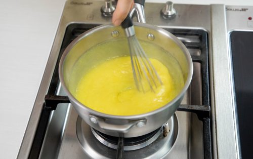 1.เตรียมเลมอนเคิร์ด ผสมน้ำตาลทราย กับผิวเลมอนในหม้อ ใส่น้ำเลมอน นมถั่วเหลือง แป้งข้าวโพด สีเหลืองเลมอน และเกลือ ตามลงไป ใช้ตะกร้อคนให้เข้ากัน ยกขึ้นตั้งไฟ กวนด้วยไฟกลางจนสุกข้น