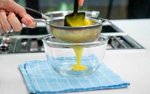 2.ยกออกจากความร้อน ใส่ชอร์ตเทนนิ่งน้ำมันรำข้าว คนให้เข้ากัน นำไปหล่อให้ชามน้ำเย็นให้เย็นลง แล้วกรองให้เนียน แช่เย็นพักไว้