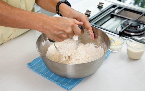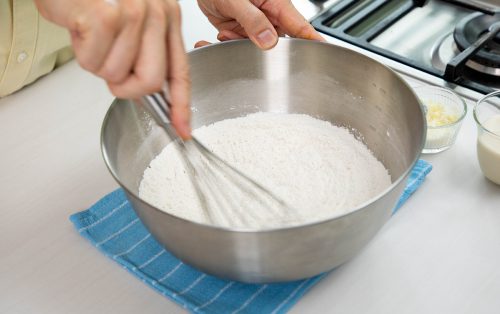 4.นำแป้งสาลี ผงฟู และเกลือ ใส่ชามผสม ใช้ตะกร้อมือคนให้กระจายทั่วดี