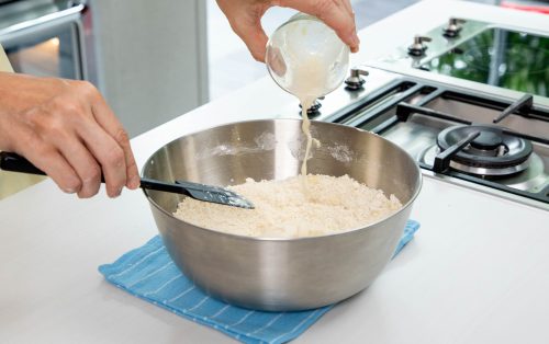 6.ใส่ส่วนผสมน้ำตาลกับผิวเลมอนลงไป คนให้กระจาย ใส่ส่วนผสมนมถั่วเหลือง ใช้พายยางนวดแค่พอให้ส่วนผสมจับตัวกันเป็นก้อน