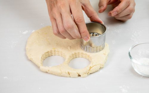 7.โรยแป้งบนโต๊ะเล็กน้อย คลึงโดหนา 1 นิ้ว ใช้คัตเตอร์ขนาด 2 นิ้ว ชุบแป้งบาง ๆ กดสโคน แล้วนำไปจัดเรียงบนถาดอบ