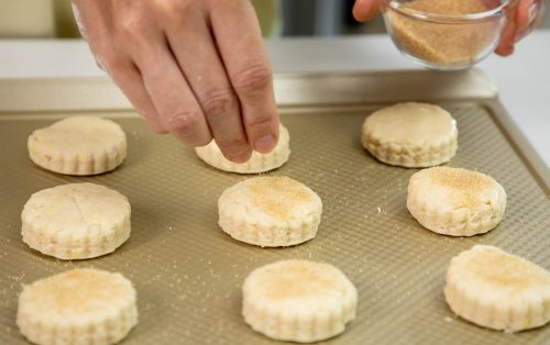 8.ละลายชอร์ตเทนนิ่งเล็กน้อย ทาลงบนสโคนบาง ๆ โรยน้ำตาลเล็กน้อย ทำซ้ำจนหมด นำสโคนเข้าอบที่ 210 องศาเซลเซียส เป็นเวลา 12 นาที