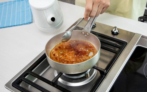9.ทำสเปรดคาราเมล โดยนำน้ำตาลทรายใส่หม้อตั้งไฟ ละลายน้ำตาลทรายจนได้คาราเมลสีเข้ม ยกออกจากความร้อน ค่อย ๆ ใส่น้ำร้อนลงไปทีละช้อนโต๊ะ เพื่อทำให้อุณหภูมิของคาราเมลลดลง ไม่ไหม้ คนให้เข้ากันดี พักให้เย็นลง