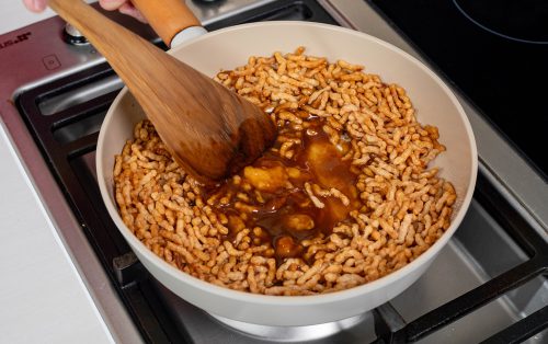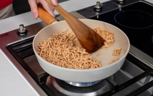 2.ตั้งกระทะใส่น้ำมันพืช นำโปรตีนเกษตรลงไปผัดจนสุกหอม