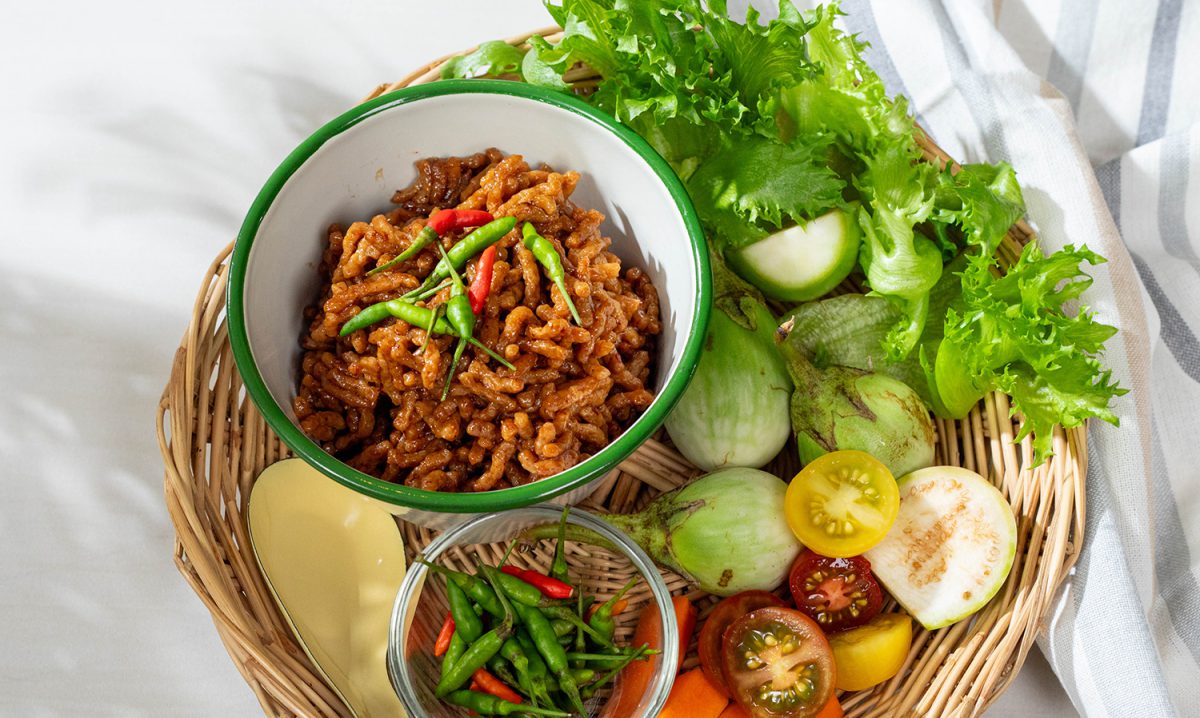 This recipe is adapted from the classic Nam Prik Makham Orn (Tamarind Chili Dip with Minced Pork) but reimagined in a vegan-friendly version. Textured vegetable protein (TVP) is used in place of minced pork, while tamarind paste replaces young tamarind for a tangy, savory-sweet balance. The dip keeps well and is perfect for enjoying with fresh or blanched vegetables throughout the vegetarian festival.